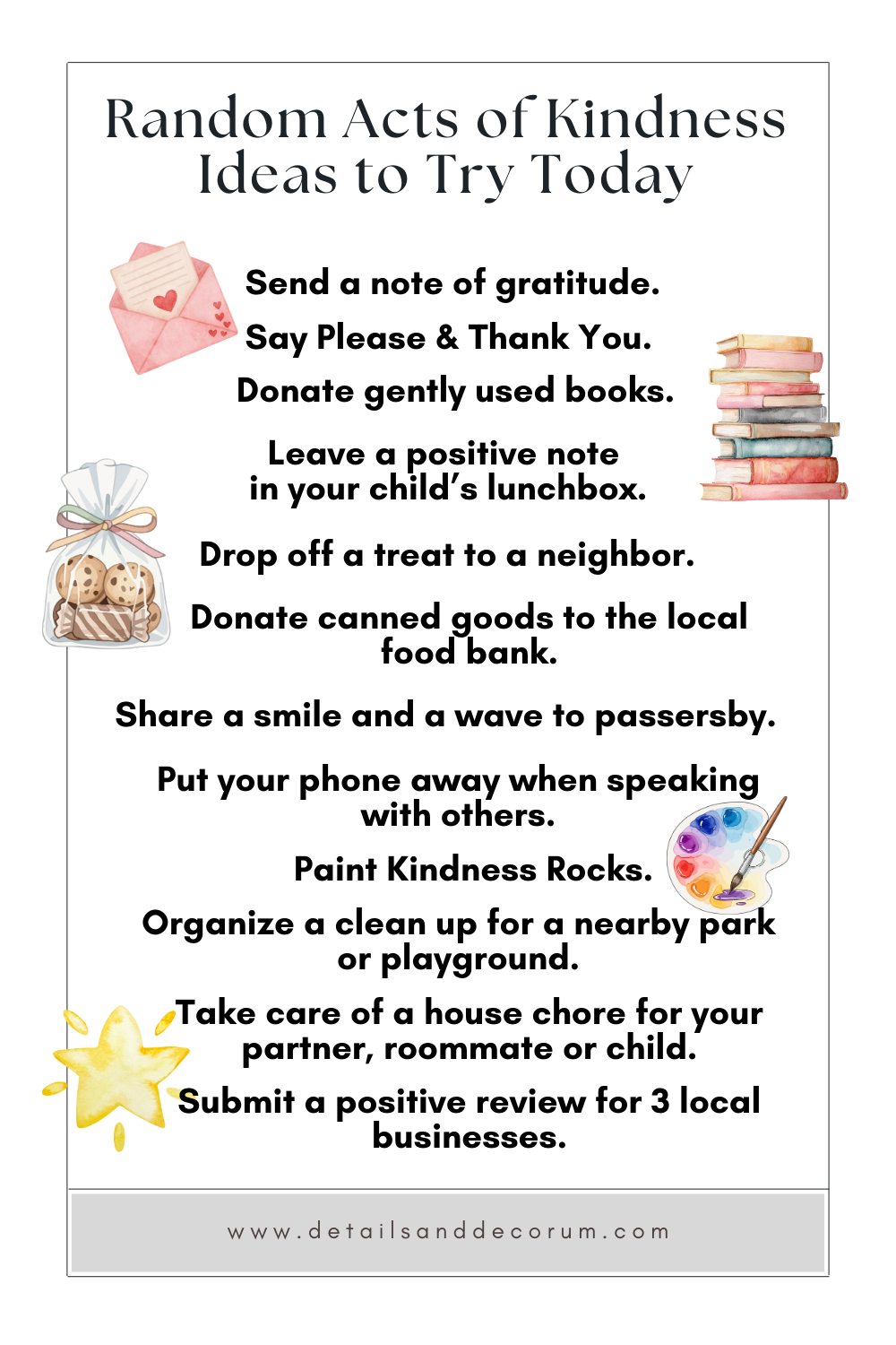 Once you complete a random act of kindness, leave a note in the comments! What did you do? How did you feel? What was the response? If this post leaves you feeling inspired, learn more about the Random Acts of Kindness Foundation for more ideas!