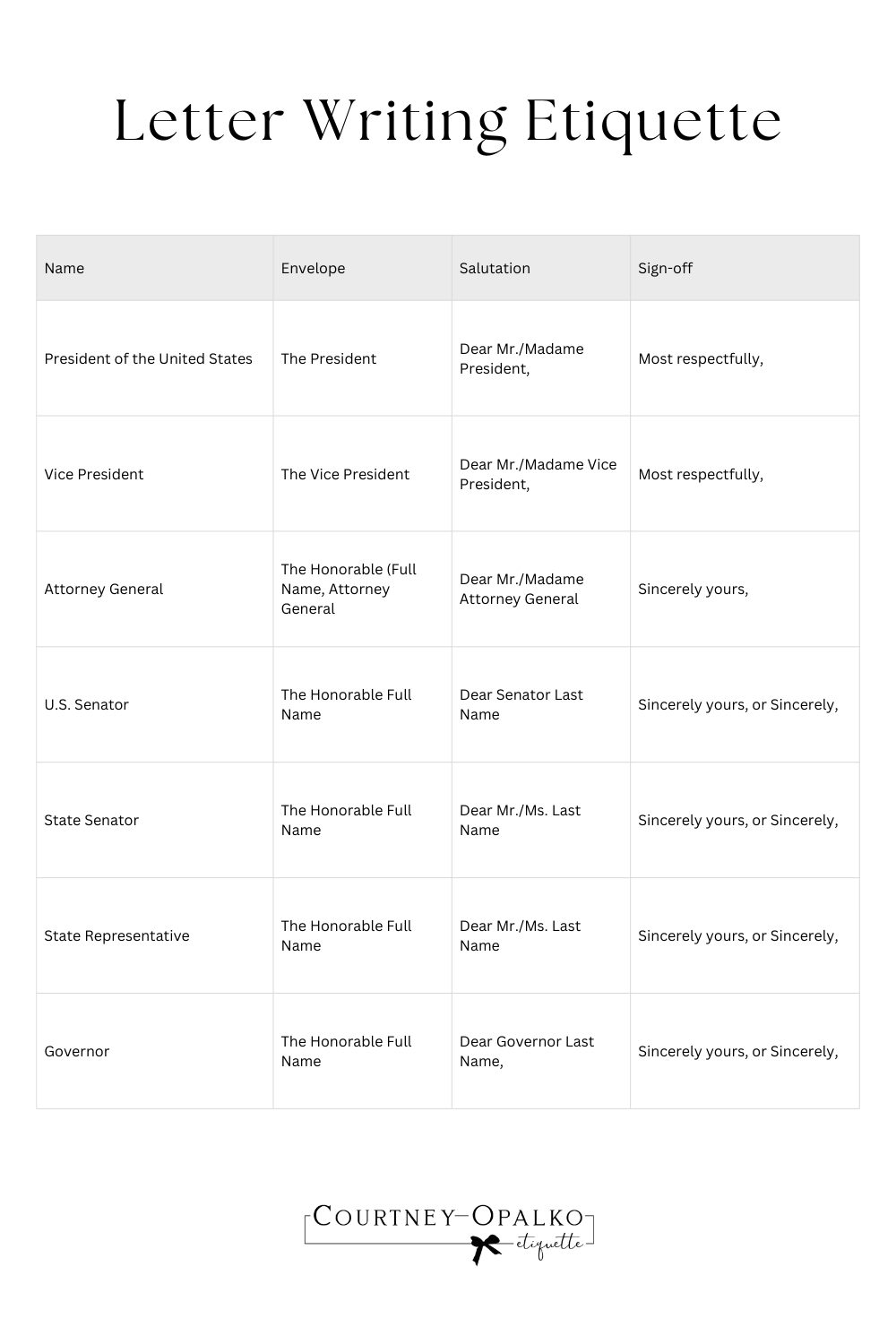 It is important to remember that courtesy titles and honorifics are not salutations, which is why Mr./Ms./Madame Last Name is often used for most positions.